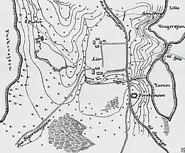 The Norwegian formation stretched about 900 m (2,953 ft) over the heights, with its right (west) protected by the Føsker, and the left (east) by the Tarven and Vinger lakes. The Lier homesteads made up the centre, south of which a 300–400 m (984–1,312 ft) wide swampy meadow stretched, which turned into impassable boglands further west; additional heights arose behind the meadow, covered in a coniferous forest, which could only be traversed after certain difficulty. The Norwegians had, furthermore, established a vital redoubt a few hundred metres south of their left wing, to observe the main road.[13][14]