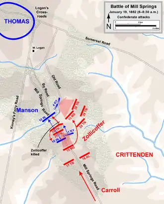 In late 1861, Confederate Brig. Gen. Felix Zollicoffer guarded Cumberland Gap, the eastern end of a defensive line extending from Columbus, Kentucky. In November he advanced west into Kentucky to strengthen control in the area around Somerset and made Mill Springs his winter quarters, taking advantage of a strong defensive position. Union Brig. Gen. George H. Thomas, ordered to break up the army of Maj. Gen. George B. Crittenden (Zollicoffer's superior), sought to drive the Confederates across the Cumberland River. His force arrived at Logan's Crossroads on January 17, 1862, where he waited for Brig. Gen. Albin Schoepf's troops from Somerset to join him. The Confederate force under Crittenden attacked Thomas at Logan's Crossroads at dawn on January 19. Unbeknownst to the Confederates, some of Schoepf's troops had arrived as reinforcements. The Confederates achieved early success, but Union resistance rallied and Zollicoffer was killed. A second Confederate attack was repulsed. Union counterattacks on the Confederate right and left were successful, forcing them from the field in a retreat that ended in Murfreesboro, Tennessee.