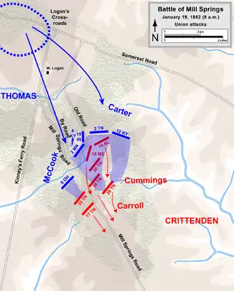 Union Brig. Gen. George H. Thomas received orders to drive the Confederates across the Cumberland River and break up Crittenden's army. Thomas left Lebanon and slowly marched through rain-soaked country, arriving at Logan's Crossroads on January 17, where he waited for Brig. Gen. Albin F. Schoepf's troops from Somerset to join him.[5] Crittenden, who until early January had remained in his headquarters in Knoxville, arrived at Mill Springs and realized that his inexperienced subordinate was in a dangerous situation. He devised a plan to attack the Union force before it could concentrate against him. One section of the Union Army, three brigades under Thomas, was located at Logan's Crossroads, while Schoepf's brigade was at Somerset, separated by rain-swollen Fishing Creek, which might be a sufficient barrier to prevent the forces from joining quickly. Crittenden ordered Zollicoffer to attack the Union camp at Logan's Crossroads at dawn on January 19.[6]