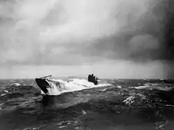 On the evening of 14 October, as New York led the force back into Pentland Firth, she was rocked by a violent underwater collision on her starboard side, followed shortly after by another to the stern that broke off two of her propeller blades, reducing the ship to one engine and a speed of 12 kn (14 mph; 22 km/h).[55] It was immediately clear to the men on board that she had struck an underwater object, but the depth of the channel meant it could not have been a shipwreck. Both Admirals Rodman and Beatty concluded that New York must have accidentally collided with a submerged German U-boat.[55] They agreed that the submarine had rammed its bow into the ship's side, then been struck moments later by the ship's propeller.[56] In their opinion, the damage would have been fatal to the German craft.[57]