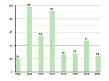 | 1902 | 1923 | 1959 | 1970 | 1979 | 1989 | 2001 | 2011 |