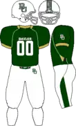 The traditional Baylor uniform worn for home games consists of a gold helmet with a green interlocking BU logo on the sides and green & white stripes down the middle, green jersey, and white or gold pants; a white jersey is substituted for the green one for road games. In recent seasons, both a matte green helmet and a white helmet have been used as alternates to the gold helmet. Black jerseys as well as black or green pants have also been used giving the Bears multiple uniform combinations to choose from.