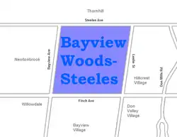 Bayview Woods-Steeles is a neighbourhood located in the northern tip of the city of Toronto, Ontario, Canada in the district of North York. It is part of federal and provincial electoral district Don Valley North, and Toronto electoral ward 17: Don Valley North. In 2006, it had a population of 13,295.[1] The area is divided by a series of ravines, and is often not considered a neighbourhood unto itself. Rather the sections are more often divided between the neighbouring areas of Hillcrest Village, Bayview Village, and Newtonbrook.