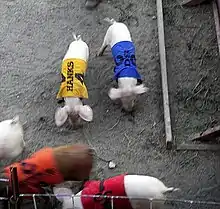 The pigs are provided by a local 4-H club,[4] and each pig can be purchased by a sponsor every racing season. The sponsor names the pig and a jersey made for it. Some past pigs names have been "Pumpkin Butt", "Raquel Belch", "Knuckles", "Pig O'War", "Ursowla Hamdress", and "Notta Hot Dog".[4] After the racing season is over, the pig is slaughtered and the sponsor has the option of donating the meat to charity or to keep it themselves. Pig Sponsors also can purchase billboard space around the racetrack, adding to the "stadium" effect. Some sponsors in the past have been the Riverboat Casino in Billings, Montana, the U.S. Bank in Red Lodge, Shipton's Big R ranch supplies in Billings, and Maxwell's restaurant in Cody, Wyoming.[4] The Carbon County Health Department and the U.S. Department of Agriculture oversee the health and condition of the pigs.[4]