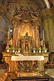 The interior is characterized by sumptuous decorations in gold; in the upper sector is an arcaded matronaeum with blue and golden columns. It also houses a large gallery of artworks from the late 15th to the early 19th century, executed by the major artists working in Lodi. There are four panels by Bergognone, including an Annunciation and a Presentation at the Temple, reproducing the church's interior of the time. The Berinzaghi Polyptych and an Incoronation of the Virgin are by brothers Martino and Albertino Piazza. Finally, Callisto Piazza and Stefano Maria Legnani executed here some of his greatest works.