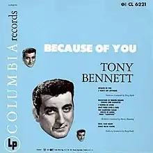 Because of You is the debut album by American singer Tony Bennett.[2] It was originally released in 1952 on Columbia as CL 6221, then reissued in 1956 (CL 2550) as part of "House Party Series".