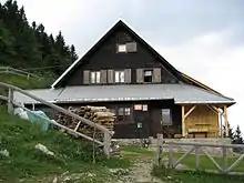 Begunjščica was once an important mining area for manganese ore in Slovenia. These mines contributed to 79% of all Slovene manganese ores processed in the ironworks of Jesenice. They were used in 1872 by the engineer Lambert von Pantz to make ferromanganese, a manganese and iron alloy, in a blast furnace, with significantly higher manganese content than was previously possible (37% instead of the previous 12%). This won the Carniolan Industrial Company 22 international recognitions, including a gold medal at the 1873 World Exposition in Vienna and an award at the Centennial Exposition in Pennsylvania in 1876.[2][3] The manganese ore was dug at Begunjščica until 1915. Altogether 130,000 metric tons (130,000 long tons; 140,000 short tons) were dug, containing on average 30% manganese.[4]