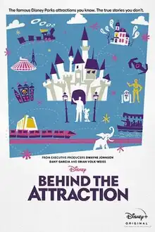 Behind the Attraction is a documentary TV series by Brian Volk-Weiss for Disney+ produced by Dwayne Johnson's Seven Bucks Productions and Volk-Weiss's The Nacelle Company.[2] The first five episodes were released on July 21, 2021, with the remaining five released August 25 of that same year.[3] The documentary is narrated by Paget Brewster.[4][5] On October 4, 2023, it was announced a second season would be released on November 1, 2023.[6]