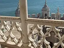 The tower has four storeys, with fenestrations and battlements, the ground floor being occupied by a vaulted cistern. On the first floor, there is a south-facing rectangular door with arched windows on the east and north, and bartizans in the northeast and northwest corners. The southern part of the second floor is dominated by a covered veranda with a loggia (matacães), consisting of an arcade of seven arches, resting on large corbels with balusters. It is covered by laced stonework to form a porch, and its sloped roof ends in a sculpted twisted rope.[6] The eastern, northern and western walls are occupied by double-arched enclosures, with the northeast and northwest corners occupied by statues of Saint Vincent of Saragossa and the archangel Michael in niches. The third floor has twin windows in the northern, eastern and western façades, with balusters, interspersed by two armillary spheres and large relief with the Royal coat of arms. The final floor is encircled by a terrace with shields of the Order of Christ, and a northern arched door and eastern arched window. The terrace is enclosed by a low wall with colonnaded pyramidal merlons with bartizans in the four corners. A similar terrace above this floor offers a view of the surrounding landscape.[27][28]