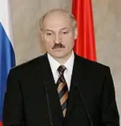 The 1994 Belarusian presidential election marked a significant conflict between pro-Russian and pro-Western groups of nationalists. In the former camp was Alexander Lukashenko, a collective farm manager from the country's east. In the latter camp were Pazniak and Shushkevich.[37] Lukashenko won the election and soon set out reversing the trends of Belarusianisation which had been carried out by the government from 1991 to 1994. In 1995, Lukashenko held a referendum to establish Russian as a co-official language with Belarusian and restore the symbols of the Byelorussian SSR. The referendum succeeded with 64.8% turnout, though the results were widely condemned as rigged by the opposition and the Organization for Security and Co-operation in Europe. For his part, Lukashenko claimed that he was not involved in Russification, instead blaming Masherov.[37]