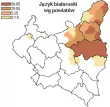The Belarusian minority in Poland is composed of 47,000 people according to the Polish census of 2011.[1] This number decreased in the last decades from over 300,000 due to an active process of assimilation.[2] Most of them live in the Podlaskie Voivodeship.