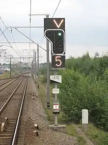 It may also present a yellow number above the signal with the main aspects green-yellow horizontal and green-yellow vertical and thus the speed (in tens of km/h) with respect to the next signal.