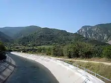 The Sestrimo Hydro Power Plant is situated near the village of Sestrimo and was inaugurated in 1973. It is a derivation power plant, linked with the Stankovi Baraki Reservoir via a pressure derivation with a length of 4.9 km and an average water fall of 534 m. The plant has two Pelton turbines with a total installed capacity of 240 MW, generating an average of 291 GWh annually.[2][4] The processed water flows out through an open channel with a length of 4.3 km.[13]