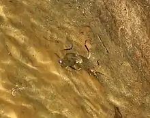 Belostomatids are aggressive predators that stalk, capture, and feed on fish, amphibians, as well as aquatic invertebrates such as snails and crustaceans. The largest species have also been found to capture and feed on baby turtles and water snakes.[10] They often lie motionless at the bottom of a body of water, attached to various objects, where they wait for prey to come near. They then strike, injecting a venomous digestive saliva with their rostrum. Although their bite is excruciatingly painful, it is of no medical significance.[7] Occasionally, when encountered by a larger animal or a human, they have been known to "play dead" and most species can emit a fluid from their anus.[4][7] Due to this, they are assumed dead by humans only to later "come alive" with painful results.[7]