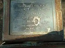 There is a historical marker, on the old mountain road between Araluen and Majors Creek, where Hall and his gang made a surprise attack, while attempting to rob the Araluen gold escort on 13 March 1865, during which Constable John Kelly was seriously wounded. The driver, John Blatchford, was slightly wounded, but was able to run downhill toward Araluen, to summon assistance. The gold was fearlessly defended by Constable Daniel Byrne. The other two police—Stayplton and Mac Ellicott—dismounted and outflanked the bushrangers, who then escaped empty-handed.[14][15] The wagonette that was carrying the gold is preserved in the Braidwood Museum.[16]