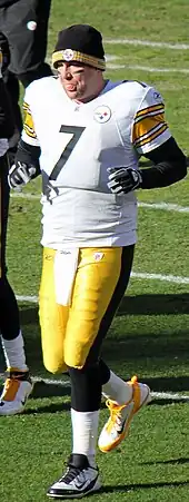 Benjamin Todd Roethlisberger Sr. (/ˈrɒθlɪsbɜːrɡər/; born March 2, 1982), nicknamed "Big Ben", is an American former football quarterback who played in the National Football League (NFL) for 18 seasons with the Pittsburgh Steelers. He played college football for the Miami RedHawks, and was selected by the Steelers in the first round (11th overall) of the 2004 NFL Draft.