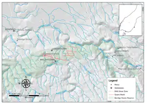 Mining continued until 1943, when the government mining subsidy was withdrawn.[3] Renewed interest since then has triggered activity in the 1980s, early in the 21st century, and again in the 2020s.[4] The Bendigo Goldfields region is located 17 kilometres (11 mi) to the northeast of Cromwell, at the head of Lake Dunstan.
