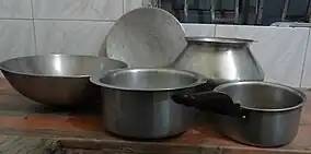 A korai is a cooking vessel for most Bengali sauces and stir-fry. The dekchi (a flat-bottomed pan) is used generally for larger amounts of cooking or for making rice. It comes with a thin flat lid which is used also to strain out the starch while finishing up cooking rice. The tawa is used to make roti and paratha.[47] The other prominent cooking utensil is a hari, which is a round-bottomed pot-like vessel. The three mentioned vessels all come in various sizes and in various metals and alloys.[48]