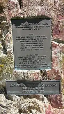 Beniamino "Bene" Bufano (October 15, 1890 – August 18, 1970) was an Italian American sculptor, best known for his large-scale monuments representing peace and his modernist work often featured smoothly rounded animals and relatively simple shapes. He worked in ceramics, stone, stainless steel, and mosaic, and sometimes combined two or more of these media, and some of his works are cast stone replicas. He had a variety of names used and sometimes went by the name Benvenuto Bufano because he admired Benvenuto Cellini. His youthful nickname was "Bene", which was often anglicized into "Benny". He lived in Northern California for much of his career.