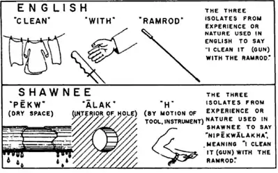 Whorf was also influenced by gestalt psychology, believing that languages require their speakers to describe the same events as different gestalt constructions, which he called "isolates from experience".[69] An example is how the action of cleaning a gun is different in English and Shawnee: English focuses on the instrumental relation between two objects and the purpose of the action (removing dirt); whereas the Shawnee language focuses on the movement—using an arm to create a dry space in a hole. The event described is the same, but the attention in terms of figure and ground are different.[70]