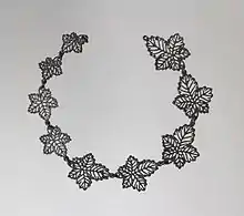 The roots of Berlin iron jewellery in Berlin can be traced back to the establishment of the Königliche Eisengiesserei bei Berlin or Royal Berlin Foundry in 1804.[2] The Royal Berlin Foundry started with the production of iron goods such as vases, knife stands, candelabra, bowls, plaques and medallions, as well as more commercial articles such as fences, bridges and garden furniture. The first jewellery items, such as long chains with cast links, were produced in 1806. Later, necklaces consisting of medallions and joined with links and wirework mesh were manufactured.[1] When Napoleon took Berlin in 1806, the moulds appear to have been taken back to France, where further production took place for some years.[3]