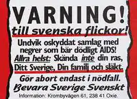 Claiming not to be racists, their often aggressive sticker campaigns arguably indicated otherwise with slogans such as "Låt inte din dotter bli en negerleksak" (Don't let your daughter become a negro toy) and "Negrer hotar sina offer" (Negros threaten their victims).[1]