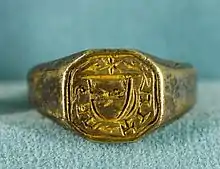 A bezel is a wider and usually thicker section of the hoop of a ring, which may contain a gem or a flat surface (usually with an engraved design, as in a signet ring).[1] Rings are normally worn to display bezels on the upper or outer side of the finger. In gem-cutting the term bezel is used for those sloping facets (also called sides or faces) of a cut stone that surround the flat table face,[2] which is the large, horizontal facet on the top.[3]