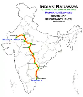 The 20481/20482 Bhagat Ki Kothi–Thiruchirappalli Humsafar Express is a Superfast Express train belonging to North Western Railway zone that runs between Bhagat Ki Kothi and Tiruchirappalli Junction. It was announced to be operated with 14815/14816 train numbers on a weekly basis. Initially it was introduced as Tambaram–Bhagat Ki Kothi Humsafar AC Express. After July 21, 2021, it was upgraded as Superfast Express and it was extended to Tiruchirappalli Junction and will run as Bhagat Ki Kothi–Tiruchirappalli Junction Humsafar AC Superfast Express with new timings from Tiruchirappalli Junction to Bhagat Ki Kothi. And the timings between Bhagat Ki Kothi–Tambaram remains unchanged.[1][2][3]