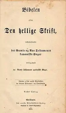 The Picture-Bible of the Norwegian People, Containing the Canonical Books of the Holy Scripture was published privately in Christiania in 1840. This Bible was illustrated with 100 photographs, and was mainly based on the Reformation Bible (Christian III's Bible).