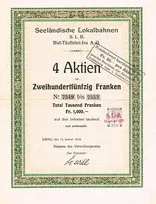 The line was originally built by Seeländische Lokalbahnen (SLB), which was founded in 1912 with its headquarters in Täuffelen. The first section of the line from Nidau to Siselen was opened on 4 December 1916 and the section from Siselen to Ins followed on 19 March 1917. Since the line ends in Ins next to the standard-gauge line of the Bern–Neuchâtel railway (BN), a transporter wagon yard was opened at the same time for the carriage of standard gauge freight cars on the metre-gauge line. The line was electrified at 1200 V DC from construction.[2]