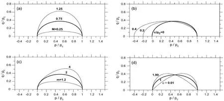 define the shape of the meridian and deviatoric sections. In particular, some of the parameters are easily relatable to mechanical properties: controls the pressure sensitivity, and are the yield strength under isotropic conditions of tension and compression. The other parameters define the shape of the surface when intersected by the meridian and deviatoric planes: and define the meridian section, and define the deviatoric section.
