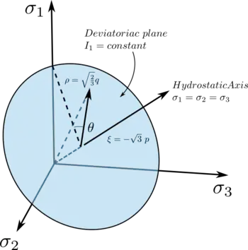 A better understanding of those important parameters can be grasped by using their geometrical representation in the Haigh–Westergaard stress space.[4] Considering the tern of principal stresses and the deviatoric plane , orthogonal to the trisector of the first quadrant and passing through the origin of the coordinate system, the tern and unequivocally represents a point in the space acting as a cylindrical coordinate system with the trisector as an axis: