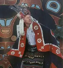 In 1942 Holm worked at Henderson Camp, later renamed Camp Nor'wester, a summer camp located in the San Juan Islands of Washington state. Here he and his wife Marty struck up a friendship with Mungo Martin, which led to significant artistic accomplishments including the recording of hundreds of Kwakwaka'wakw songs, the construction of "big houses" and totem poles on Lopez Island and John's Island, many dance masks, four Haida-style canoes, and more. Martin would give Holm the names Namsgamuti (He Speaks Only Once), Hamtsi'stesalagalis (Unrestrained Hamatsa Everywhere), Ho'miskanis (Plenty of Everything, literally, Surplus Food from the River).[3] Holm was also named Tlalelitla (Continually Inviting) by Chief William Scow, Henry Bell, and Joe Seaweed.[5]