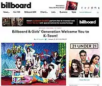 The relaunch included a new column, "K-Town", in a move to bring K-pop news, songs and music videos to its readers each week.[25] Girls' Generation welcomed the column with a video greeting,[26] and the first column article was a feature on "rising K-pop superstars" Infinite.[25][27] In April 2013, The Korea Herald said, "the effect of YouTube and the Billboard chart cannot be ignored in the international success of Psy's "Gangnam Style"," and "Billboard's recent interest in K-pop is not a fleeting phenomenon."[28]