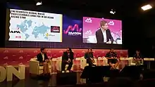 Jeff Benjamin, left and on-screen, hosting MU:CON Seoul 2018 panel on September 10.