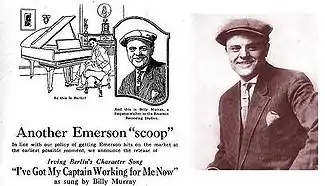 Billy Murray was born in Philadelphia, Pennsylvania, to Patrick and Julia (Kelleher) Murray, immigrants from County Kerry, Ireland.[4][5] His parents moved to Denver, Colorado, in 1882, where he grew up. He became fascinated with the theater and joined a traveling vaudeville troupe in 1893. He also performed in minstrel shows early in his career. In 1897 Murray made his first recordings for Peter Bacigalupi, the owner of a phonograph company in San Francisco. As of 2010, none of Murray's cylinder records with Bacigalupi are known to have survived.[5] In 1903, he started recording regularly in the New York City and New Jersey area, where major record companies in the U.S., as well as the Tin Pan Alley music industry, were concentrated.