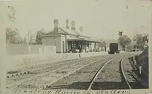 - ↑ "DESTRUCTION OF THE BINALONG RAILWAY STATION". The Burrowa News. NSW: National Library of Australia. 27 April 1883. p. 2. Retrieved 17 April 2014.
