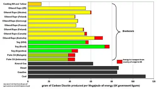 Making and burning biodiesel contributes to atmospheric carbon dioxide to a smaller extent than burning fossil fuels. The calculation of exactly how much carbon dioxide is produced is a complex and inexact process, and is highly dependent on the method by which the biofuel is produced. For example, including the emissions associated with land-use change (LUC) substantially increases the carbon cost of biodiesel.[3] The graph on the right shows the figures calculated by the UK Government for the Renewable transport fuel obligation.[4]