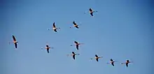 Lesser flamingos flying in formation.