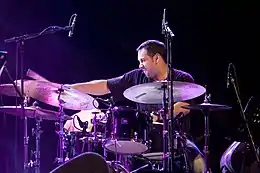 His next work on Birdman was in September, where he traveled to Los Angeles to re-record the soundtrack.[8] By this stage the film was assembled, so during the two days of recording Sánchez would watch a scene to see what Iñárritu had done with the demos, then redo the track.[15] This was a new experience for Sánchez who until this point, had guided his improvisations in response to "the sound and energy" around him. Here, he was using a scene to guide him, and said the biggest challenge of the soundtrack was "adapting what I do to a moving image, a story line, and dialogue."[16] As in New York, Iñárritu supervised these recordings, but this time would give specific directions. For example, instructing Sánchez to stop or start when Riggan uttered certain words.[11] Iñárritu also shaped the overall feel of the soundtrack. He wanted it to grow crazier throughout the film, so for the end tracks Sánchez would overdub up to four drum tracks on top of each other.[12][13] Additionally, Iñárritu was not satisfied with the quality of the sound from the previous recordings: it was too good. Instead, he wanted an instrument that sounded like it had not been played in years, to tie in with state of the theatre in the film.[11] To achieve this, Sánchez adjusted his setup; detuning the drums and stacking different kinds of cymbals on top of one another were among the techniques he used.[10][15] Amusingly, this process was included in the film – the first sound in Birdman is in fact Sánchez asking Iñárritu a question in Spanish, followed by his detuning of the drums.[10]