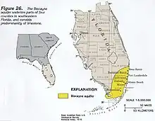 The Biscayne Aquifer, named after Biscayne Bay, is a surficial aquifer. It is a shallow layer of highly permeable limestone under a portion of South Florida. The area it underlies includes Broward County, Miami-Dade County, Monroe County, and Palm Beach County, a total of about 4,000 square miles (10,000 km2).[1]