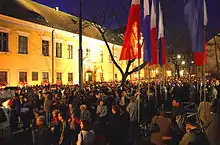 Following John Paul II's death on 2 April 2005, some 40,000 Catholics gathered in front of the palace for a night vigil and prayer (pictured).[6][8] On each anniversary of his death, thousands of flowers are placed around the building and many fires are lit.[4] The window above the entrance is known as the "papal window", as from here John Paul II spoke to the crowds that gathered to see him.[4][5] In the courtyard stands a statue of John Paul II sculpted and gifted to the palace by artist Jole Sensi Croci in May 1980.[6]