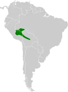 It is found in moist forest lowlands in subtropical and tropical regions up to 900 m (3,000 ft) altitude.[6] This species is native to southeastern Peru and northern Bolivia.[4] Has recently been recorded in Brazil.[7]