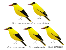 The subspecies in the Andamans, O. c. andamanensis has all black wings while O. c. macrourus of the Nicobars has a very broad nape band so that only the top of the head is yellow. The wings are all black with a yellow primary covert patch. The calls of the Andaman and the Nicobar subspecies are said to be quite different, the latter having a more modulated call note.[11][12] In the Southeast Asian populations some geographic trends include a reduction of yellow on the forehead and a decreased brightness in the yellow plumage from north to south. Females from southern populations are more greenish on the back and tail and there are no yellow spots on the tips of the secondaries as in northern populations.[13]