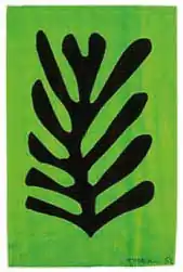Black Leaf on Green Background (1952) is a collage by Henri Matisse. The medium is gouache and cut paper on paper. It is in the Menil Collection, Houston, Texas. During the early-to-mid-1940s Matisse was in poor health, and by 1950 he stopped painting in favor of his paper cutouts. Black Leaf on Green Background is an example of Matisse's final body of works known as the cutouts.[1]