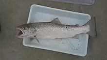 The Black Sea salmon (Salmo labrax) is a fairly small species of salmon, at about 20 inches (510 mm) long on average and rarely reaching over 30 in (760 mm). It inhabits the northern Black Sea coasts and inflowing rivers. There are anadromous, lacustrine and resident river populations.[1] This fish is a close relative of the brown trout. While it is the only native species of Salmo present in the northern Black Sea basin, it may hybridize with (introduced) brown trout in the major rivers.[1] Sea-run populations are currently at low numbers, but the resident river stocks are doing well.[1]