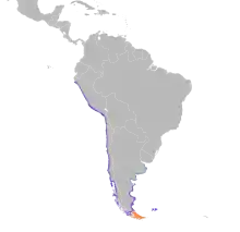 The blackish oystercatcher is native to the coasts of Argentina, Chile, the Falkland Islands and Peru, and it is a vagrant to Uruguay.[1] Its natural habitats are rocky shores. It feeds in the intertidal zone on rocky shorelines, in rockpools and on pebble beaches. Rarely, it can be found on sandy beaches hunting for mole crabs.[3]