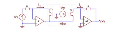 The control voltage VY is usually referenced to ground, either with one terminal grounded or with both terminals driven differentially with zero volts common-mode voltage. This requires lowering emitter potential below ground, usually with an operational amplifier A1 that also converts input voltage VX into input current I1 (so-called transdiode configuration). A second operational amplifier A2 converts output current I2 into output voltage VXY.[18][14]