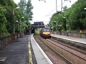 The street-level platform, which now bears the "portacabin" ticket office, once supported a wooden station building which housed a ticket office and newsagent. On the night of 12 January 1987, shortly after being painted in the bright orange livery of the Strathclyde Passenger Transport Executive, this building was burned to the ground. The station now has a staffed ticket office during working hours (Monday-Saturday). A new purpose built car park on the site of the former St. Ambrose High School now serves the station.[2]