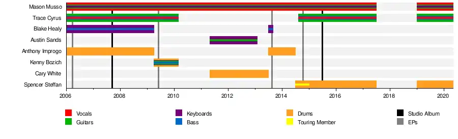 In 2005, Mason Musso and Trace Cyrus agreed to meet on the set of Hannah Montana, which starred Mason's brother, Mitchel, and Trace's sister, Miley. Sharing musical interests, they decided to form a band.[6] Shortly thereafter, Cyrus recruited Blake Healy from Synthetic Joy and the Bum Out Eternal as a keyboardist, synthesist, and bassist.[9][6] Metro Station soon gained the attention of drummer Anthony Improgo, who was added as the band's drummer after the group released the song "Seventeen Forever" on its MySpace Music website.[10] The group's popularity on MySpace Music grew, and the band eventually topped the MySpace Music Unsigned Band's charts.[10] The group self-released their debut EP The Questions We Ask at Night in 2006.[11]